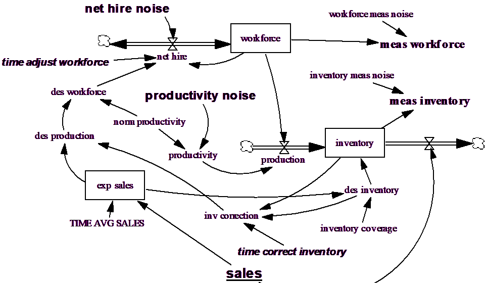 The two measurements on the system are meas workforce and meas inventory. Both of these are direct measurements containing errors (meas noise) from for the corresponding model levels. Sales is an exogenous driver, with values specified in the data file sales.dat.