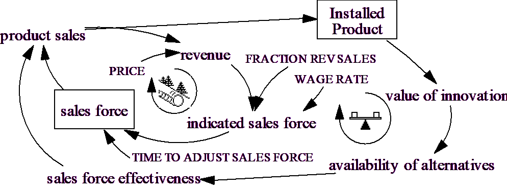 | sales force = INTEG((indicated sales force - sales force ) / |