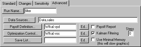 For the Kalman filtering run, enter the run name filter. Enter the real world data (data.vdf) into the Data Sources… field (along with sales.vdf). Enter the payoff file wfkal.vpd in the Payoff Definition… field. Turn on Kalman filtering by checking the Kalman Filtering box. When you click on this the file kalman.prm will automatically be used. You do not need to name this file in the Simulation Control dialog. The Simulation Control should appear as below: