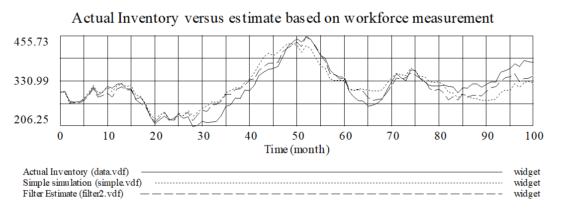 The use of filtering provides better estimates of the amount of inventory by combining the information in the model (that predicts what a value will be) with the information in the measurements (data collected from the system). This is true for measured variables, and it is also true for unmeasured variables. For example, suppose that we had measurements for Workforce but not for Inventory. It is still possible to make estimates of the value of Inventory using this data. If you create the file wfkal2.vpd containing: