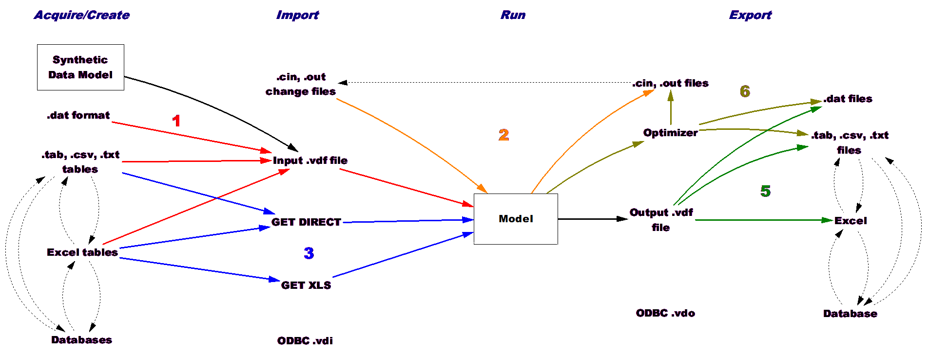 Importing a data file creates a .vdf dataset that can be read by a model as comparison data or sources for data variable values. The Model>Import Dataset... and from .dat format... menu options provide access to most common formats.
